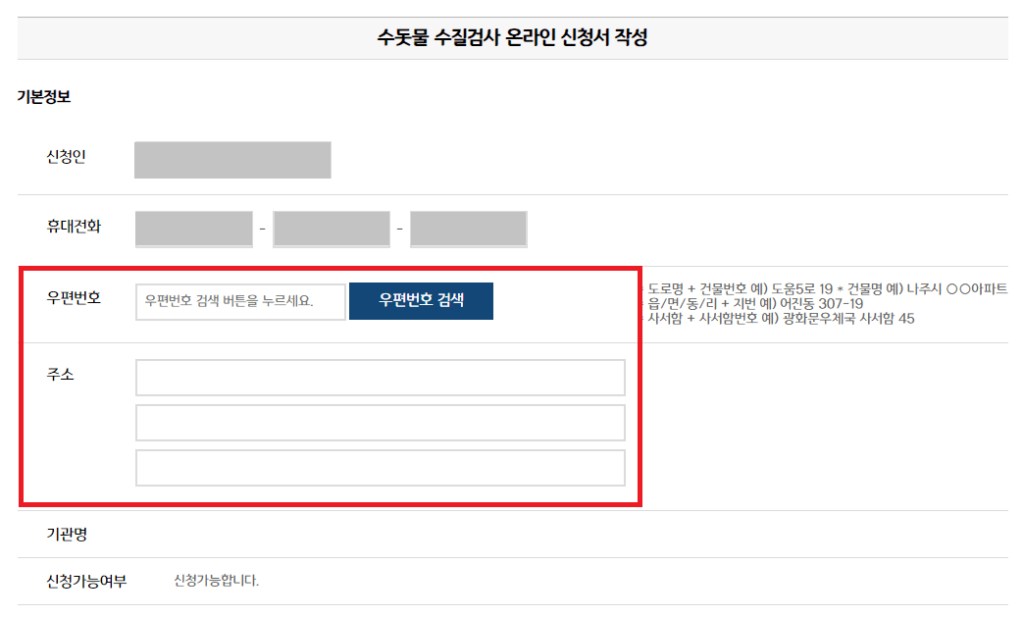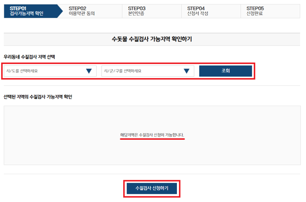 가능한 지역이라면 하단에 “해당지역은 수질검사 신청이 가능합니다”라는 문구가 나옵니다.