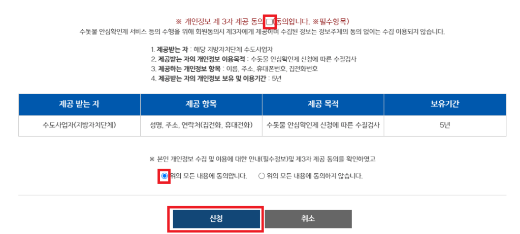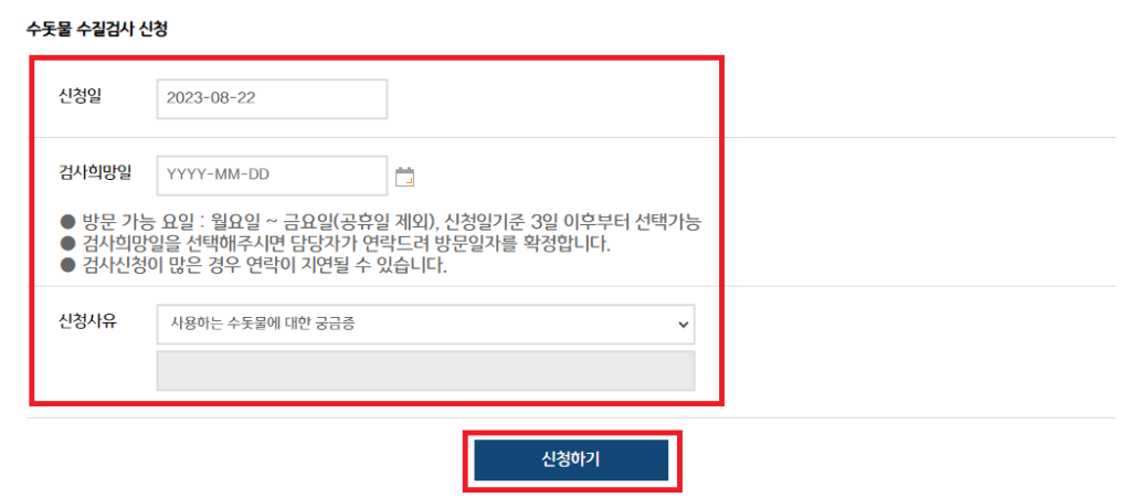 문구를 확인하신 후 ‘수질검사 신청하기’ 버튼을 클릭하세요.