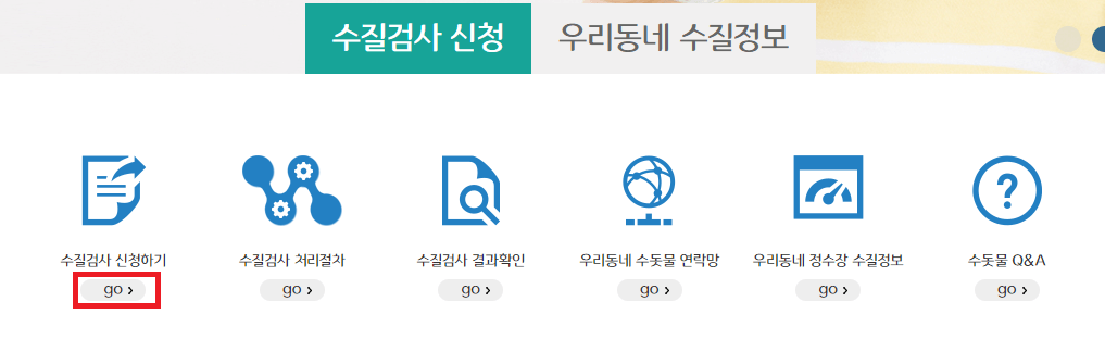왼쪽에 ‘수질검사 신청하기’에서 ‘go’ 버튼을 클릭하세요.