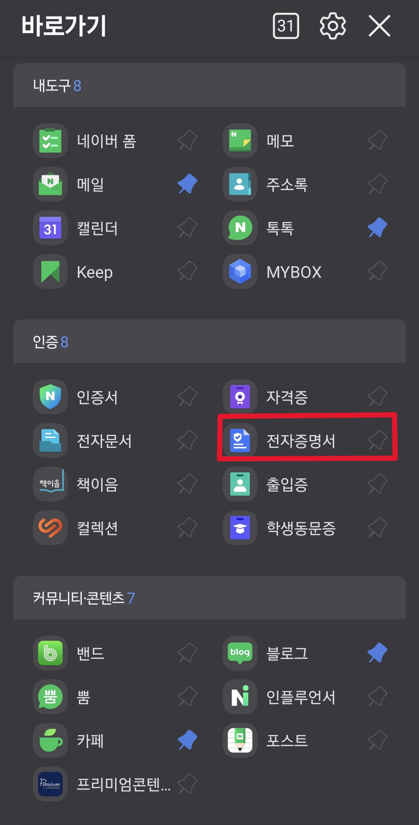 1) 네이버 앱 실행 후 '인증' 메뉴에서 '전자증명서' 클릭
