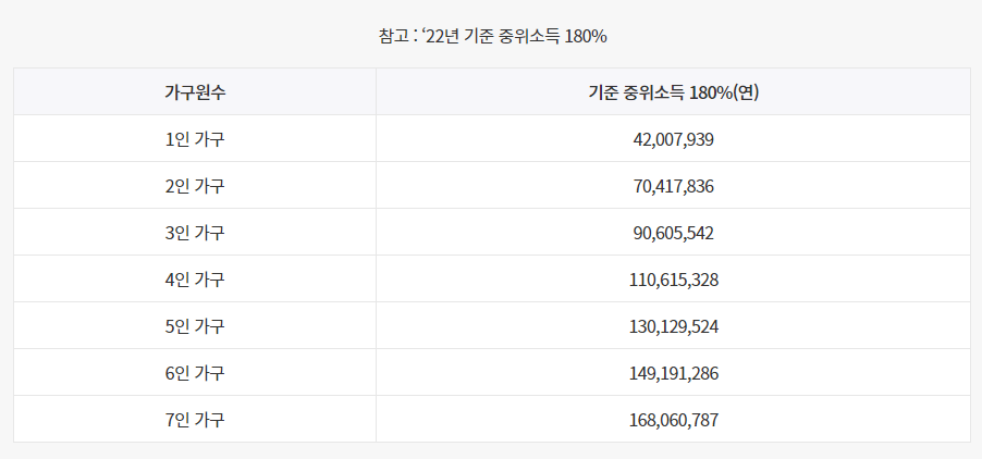 가구소득의 경우 가구원 수에 따른 소득의 합이 지난해 기준 중위소득의 180% 이하여야 합니다.