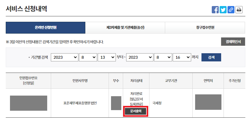 서비스 신청내역을 확인하신 후 처리상태에서 ‘문서출력’을 클릭합니다.