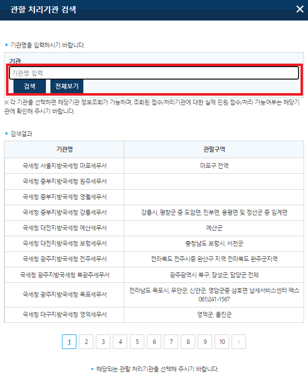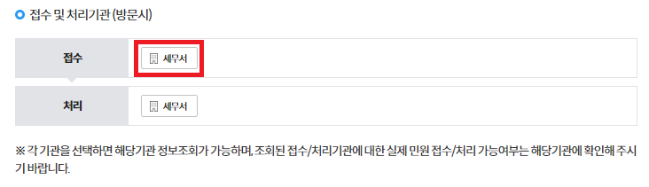 관할 처리기관을 검색하시려면 아래 링크로 들어가서 ‘접수 및 처리기관(방문시)’란에 ‘세무서’를 클릭합니다.