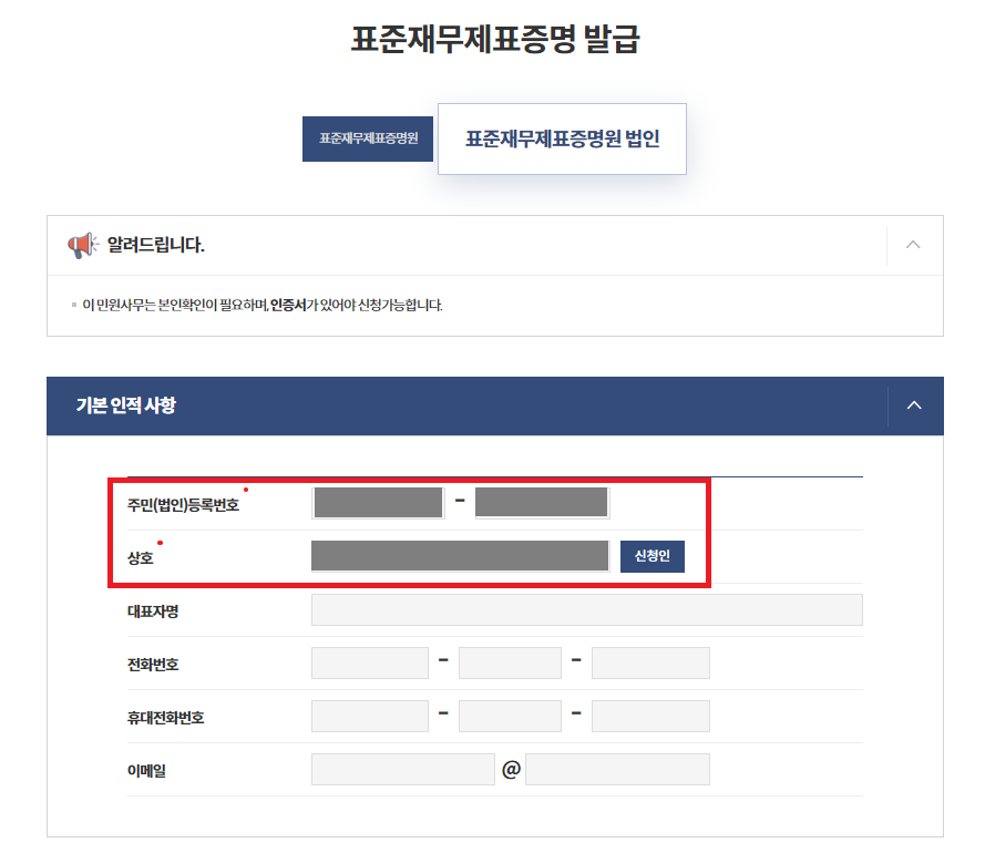 표준재무제표증명 발급을 위해 기본 인적 사항을 기입합니다. 여기서는 법인용으로 발급 신청을 해보겠습니다.