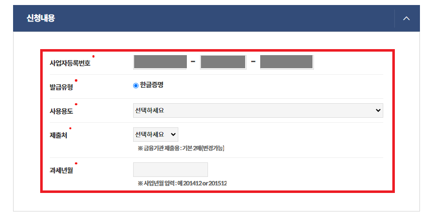 신청내용으로 사업자등록번호와 사용용도, 제출처, 과세년월을 입력하세요.