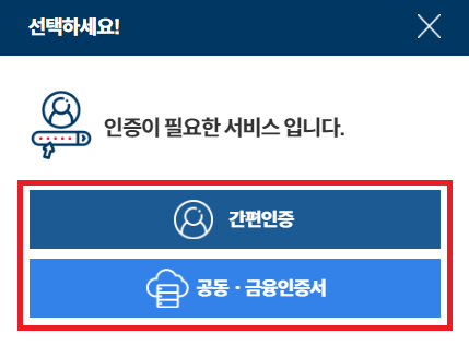 표준재무제표증명 발급은 인증이 필요한 서비스입니다. 간편인증이나 공동인증서, 금융인증서 중 하나를 선택합니다.